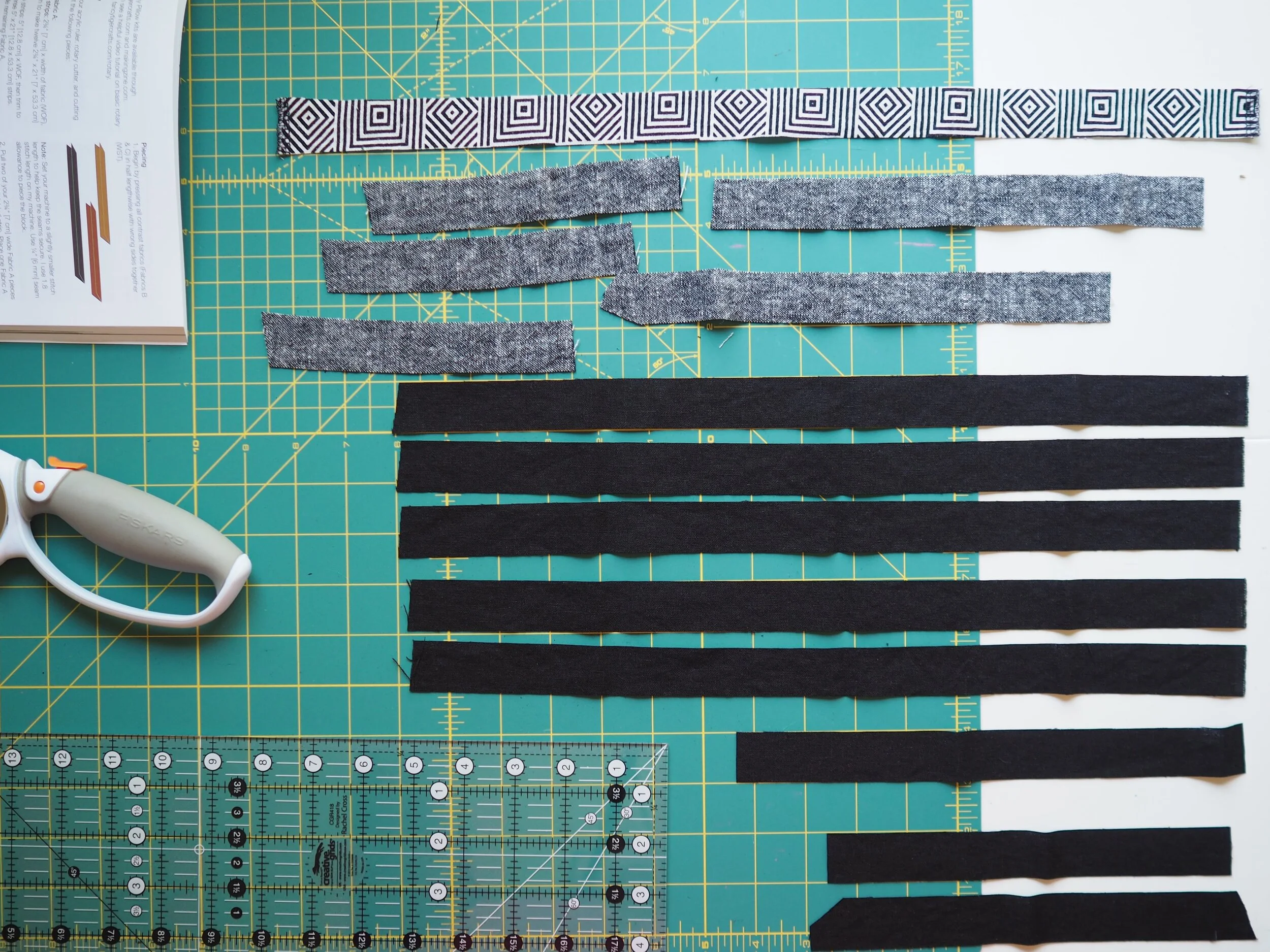 Each (finished) strip is 4 inches wide, so it’s easy to increase / decrease the block size in 4-inch increments by increasing/decreasing the number of strips used, and lengthening them the same number of increments.