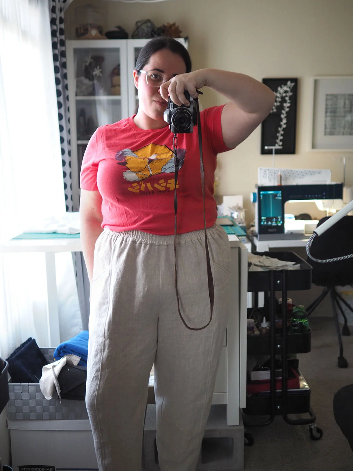 Lessons: The Muna and Broad size chart is a little larger than my waist measurement (39") however because these pants have an elasticated waistband, I can cinch the elastic to a circumference that fits my waist. The 52" of the finished garment left around 3-4" of ease around my hip which feels good when standing and sitting. I've since worn these pants a couple days in a row and noticed that the linen does relax due to my body warmth, so I think the fit is in the sweet spot for this style & fabric.