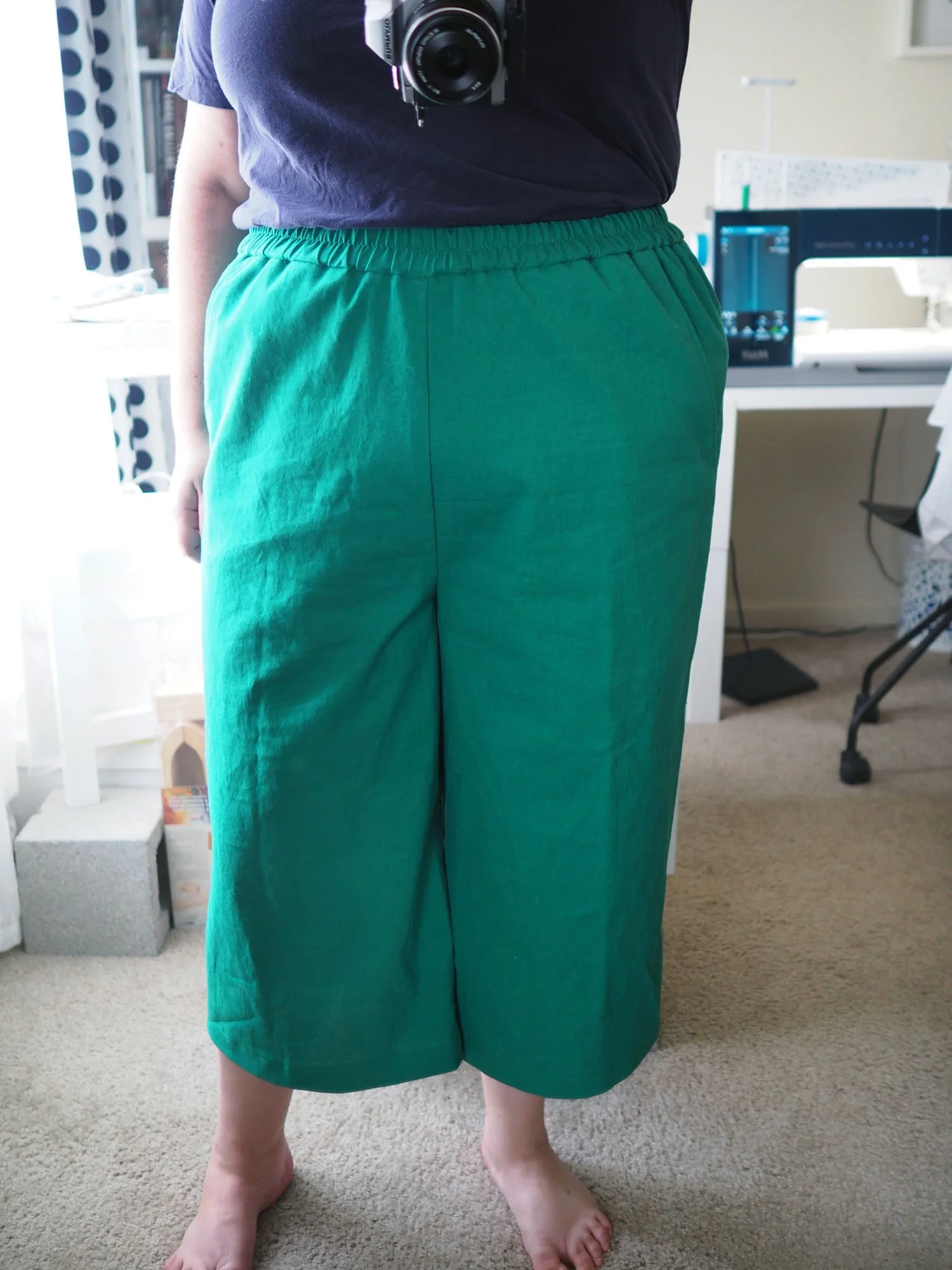Modifications: Reduced leg length to make culottes. (Took the standard Glebe pattern and overlaid the Ninni Culotte at the outer seam to determine optimal length, then used the hemming instructions from the Ninni pattern. Double checked that the marks were aligned at the outside edge of the front & back pattern pieces.)