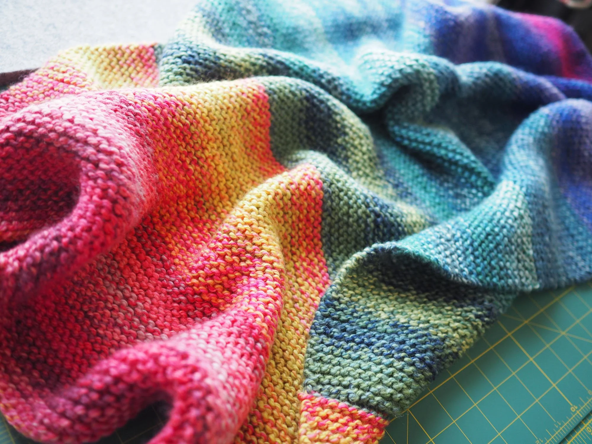 Pattern/Technique: Self drafted. Cast on 100 stitches in a waste color, then knit 38 rows of each rainbow panel.