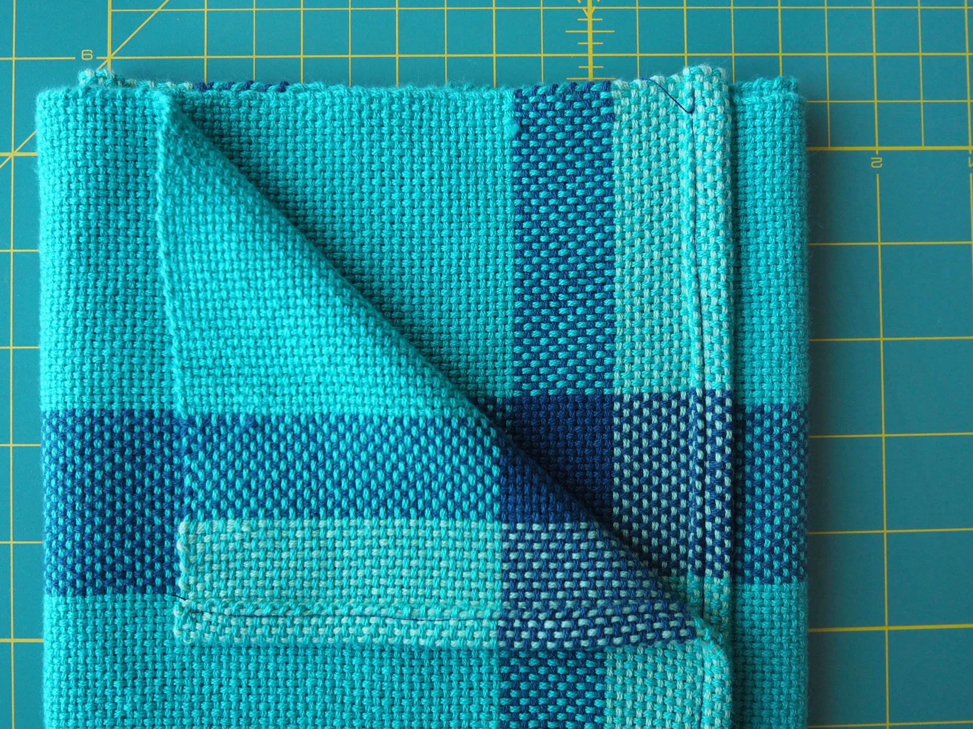 • Sewed the hem by aligning the center of the presser foot with the folded edge of the hem. I was having a bunch of trouble getting the feed dogs to engage at the start of the seam (even with my hump jumper tool) so I started the seam ~1” below the top of the towel, tacking at the start of the seam, sewed to the bottom of the towel, then flipped it over to tack and sew that last inch.