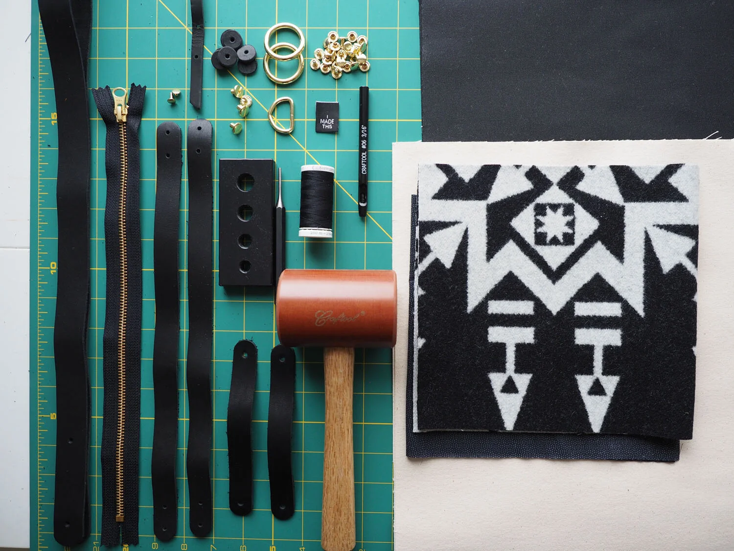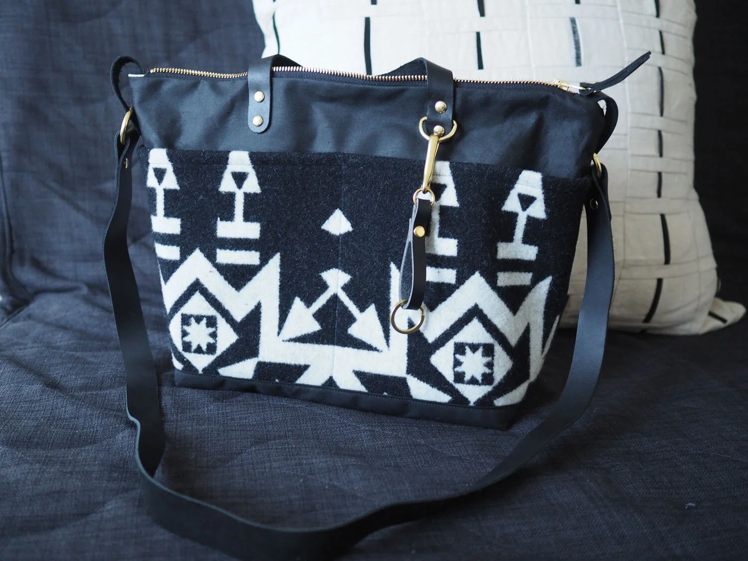 Pattern: Fremont bag kit (black waxed canvas and leather with brass hardware) with Pendleton exterior pocket expansion by Klum House. Leather Keyring kit in black by Klum House. Sewed with Gutermann polyester all-purpose thread in Black.